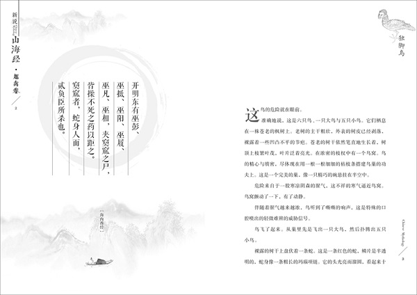 浪漫离奇的中国神话 《山海经》是重要的先秦古籍,也是一部荒诞不经的奇书。来自儿童文学研究推广学会的编写团队,千年之后致敬《山海经》,用浪漫离奇的中国神话,带领读者开启一场关于《山海经》世界的奇幻旅程。 动人心魄的趣禽传说 一篇篇古老的故事,描述着神州大地上*初的想象与智慧; 一页页奇幻的神话,传递着华夏历史中朴素的美德与情怀。 这里的“山海经”,不再是我们遥不可及的天书奇谈, 每一个上古生灵都有血有肉,演绎着各自动人心魄的传说。 唯美精妙的内页插图 由飕尔文化传播公司为本书故事绘制插图,再现山海幻境、趣禽迷踪。 原汁原味的《山海经》图文再现 每篇故事之后配有相关的古文、古图,采用“文言文 白话翻译 古字注音”的形式,帮助读者深入了解《山海经》。