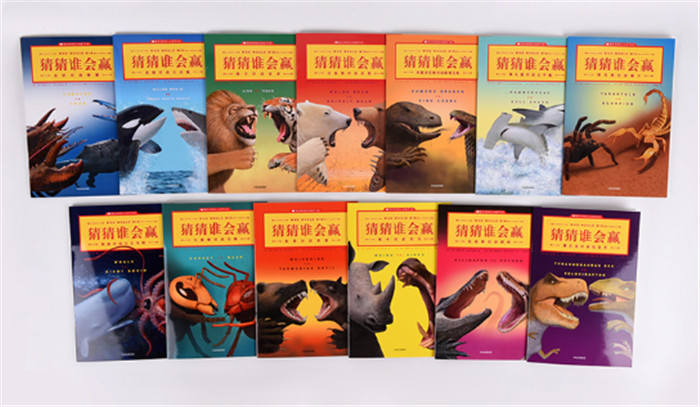 《猜猜谁会赢》是一套动物科普书。全套共13册,每一册介绍了两种相近动物的身体特征、生活习惯、捕食技巧等内容,并设想出二者对抗的情景和结果。作者在书的*后鼓励小读者通过自己分析二者的特点,做出自己的想象和判断。 书中涉及的动物包括恐龙、鳄鱼、*、熊、虎、狮、鲸鱼等大型动物,也有螃蟹、龙虾,甚至大黄蜂、马蜂、蜘蛛这样的昆虫类小型动物。是一套巧妙兼具了知识性、科学性、文学性和趣味性的动物百科系列。