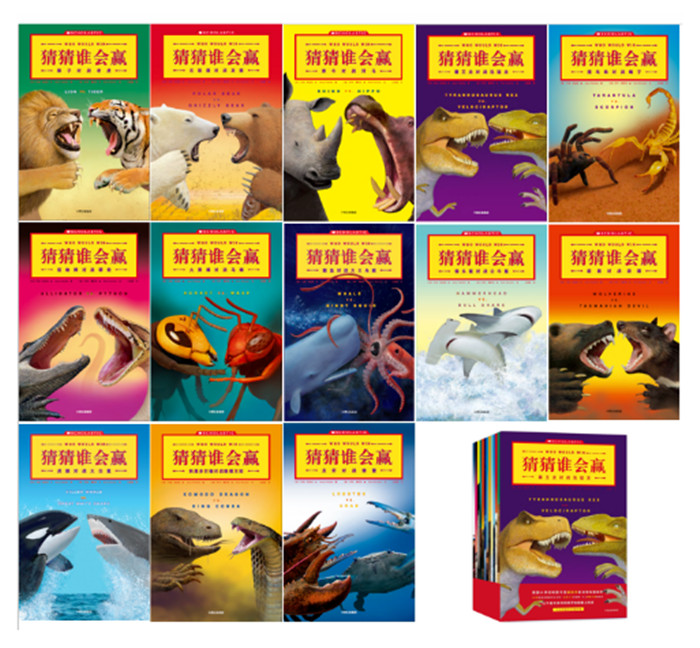 《猜猜谁会赢》是一套动物科普书。全套共13册,每一册介绍了两种相近动物的身体特征、生活习惯、捕食技巧等内容,并设想出二者对抗的情景和结果。作者在书的*后鼓励小读者通过自己分析二者的特点,做出自己的想象和判断。 书中涉及的动物包括恐龙、鳄鱼、*、熊、虎、狮、鲸鱼等大型动物,也有螃蟹、龙虾,甚至大黄蜂、马蜂、蜘蛛这样的昆虫类小型动物。是一套巧妙兼具了知识性、科学性、文学性和趣味性的动物百科系列。