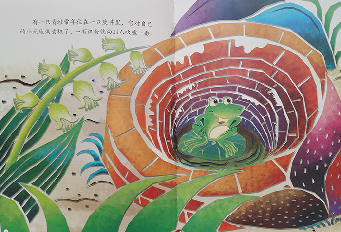 本书根据中国寓言故事改编而成,采用绘本的形式呈现,文图并茂,生动传神。 这个寓言出自《庄子·秋水》。一口废井里住着一只青蛙。有一天,青蛙在井边碰上了一只从海里来的大龟。 青蛙就对海龟夸口说: “你看,我住在这里多快乐!高兴了,就在井边跳跃一阵;疲倦了,就回到井里睡一会儿。我是这口井的主人,在井里自由自在,你为什么不到井里来游赏一番呢?” 海龟听了青蛙的话,倒真想进去看看。但它的左脚还没有伸进去,右脚就被绊住了。它连忙后退了两步,把大海的情形告诉青蛙说: “你看过海吗?海的广大,何止千里;海的深度,何止万丈。古时候,十年有九年大水,海里的水并没有涨多少;后来,八年里有七年大旱,海里的水也没有少多少。住在那样的大海里,才是真的快乐呢!” 井里的青蛙听了海龟的一番话,吃惊地呆在那里,再没有话可说了。后用这个寓言比喻固步自封、目光短浅。