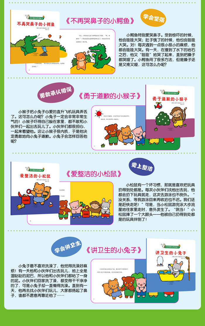 ★以调皮可爱的小动物为主人公,贴近宝宝心理,通过他们的一言一行正面引导,达到潜移默化的教育目的。