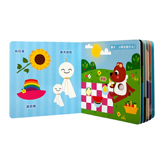 这是一套低幼洞洞认知书,分为《夜晚》《海洋》《天气》《花园》4册。颇具创意的洞洞设计满足宝贝爱抠洞洞的天性,激发宝贝的好奇心,让宝宝在游戏中认知、学习。每册书共6个跨页,前5个跨页是和主题相关的场景和认知物,第6个跨页为前5个跨页认知物的集合。采用硬纸板印刷,结实撕不烂;贴心圆角设计,保护宝宝双手不受伤。《天气》教宝宝认知不同的天气,比如晴天、雨天、雾天等,让宝宝全面认知天气,了解天气。