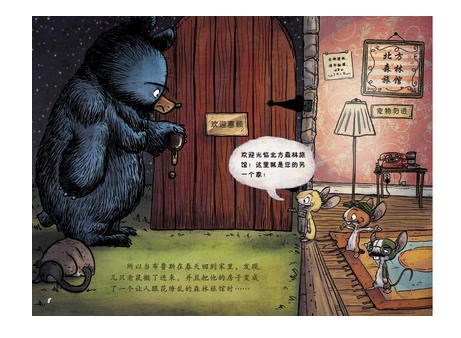 在图画的构思上,作者也运用了对比和反衬,在许多似乎不经意的细节之间,让图画或烘托主题,渲染气氛,或补充文字叙事,传递弦外之音。例如本书的前环衬和扉页:前环衬的森林小屋炊烟袅袅,屋外层林尽染。翻过来已是冬季,一片白雪皑皑、银装素裹的美景。一幅宁静的山野隐居图尽展眼前,同时宣示着家永远都是温暖的存在。而旁边书名页中,河狸欢快地啃着木餐桌,布鲁斯一脸郁闷,平静温暖的家开始出现失控的场面,两相对比营造出一种让人忍俊不禁的欢乐气氛。粉红色印花的背景墙色调 温暖,不同于《鹅妈妈布鲁斯》中灰黄色的背景,旧貌换新颜一方面暗示了老鼠对于房子的改造,说明布鲁斯的家已主权沦陷改朝换代了,另一方面也中和了布鲁斯的郁闷表情,使得画面轻快。此外,图中还有许多充满趣味的微小细节:墙上歪歪吊着的童年布鲁斯的照片,写着“宠物勿进”的牌子,布鲁斯和小鹅的合影等,这些细节使得故事更为丰满,也极大地增强了喜剧的效果。
