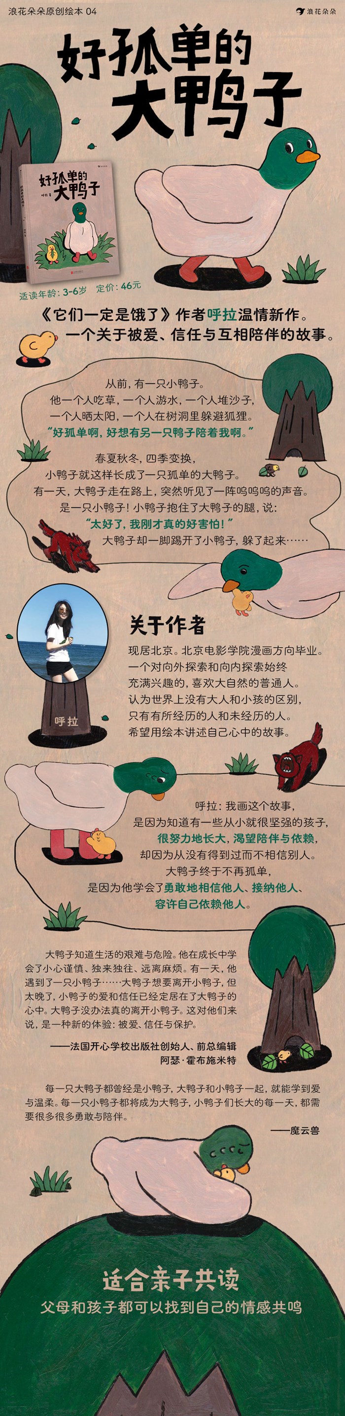 ◎ 一个父母和孩子都可以找到共鸣的故事。有时候我觉得自己就是故事里好孤单的大鸭子,在成长的过程中变得小心谨慎、独来独往。偶尔想要陪伴,在遇到小鸭子时却选择一脚踢开。小鸭子的勇敢与纯真教会我爱与信任的可贵。