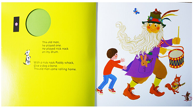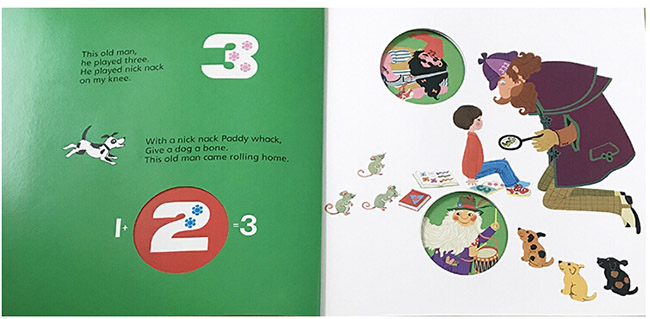 这套由知名出版社 Child’s Play 出品的儿歌洞洞书,一共9册。书的开本很大,颜色鲜艳,独特的是每页都有洞洞页的设计,透过洞洞,隔页上的画面会和当前页组成一幅完整的画,在隔页这些图画又是另一番风景。同一事物在两个不同的页面上有不同的体现,是很有趣的展现形式,这也是 Child’s Play 向来擅长的“拿手好戏”。书本底页有二维码,扫描二维码即可听到图书原版音频,方便。内容均为耳熟能详的儿歌,地道的表达,重复的句式,听起来韵律感极强,读起来又朗朗上口,非常适合给未接触过英文的宝宝进行英文启蒙。
