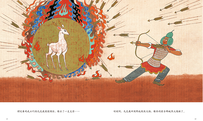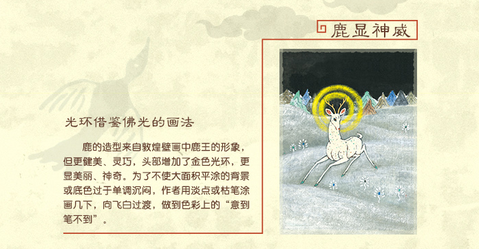 是源自敦煌壁画《鹿王本生》中的故事。讲述了神鹿显神威救人而讽刺人类贪婪狠毒的故事。画家运用了敦煌壁画的绘画风格。