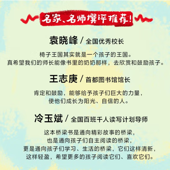 “我能自己读”系列 ★轻松地帮助幼小衔接( 5-8 岁)阶段的孩子爱上阅读。 ★在自主阅读的关键期,帮助孩子克服对阅读的恐惧感。 ★字号大,行距宽,便于孩子阅读和识别——适合识字量不多、阅读能力还不是特别强的小朋友阅读。 ★精选获奖作者与获奖内容,潜移默化地完成对孩子的品格、性格与文学素养的熏陶。 《椅子王国》 1、书中有独特的想象力,塑造了一把坚强、倔强又热心助人的椅子“小捆”的形象。相信谁都会爱上“小捆”。 2、椅子“小捆”热心助人的故事,洋溢着美好温暖的气息。送给每一个温暖善良的孩子! 美德童话!阿甲、袁晓峰、冷玉斌、旷雪名师名家撰评推荐!轻松地帮助幼小衔接( 5-8 岁)阶段的孩子爱上阅读!