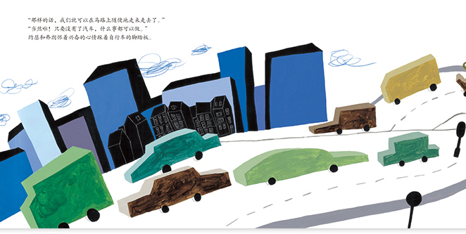 两个小男孩感受了在汽车不行驶的一天里,马路安安静静、空气新鲜,可以在路中央骑滑板车,小动物上路,他们还把花盆搬到了路上,到处充盈着香气。