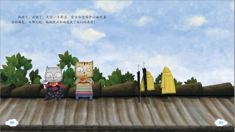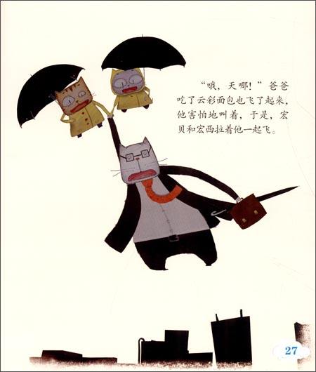 一个下雨天的清晨,小猫家的院子里发生了一件神奇的事情:一朵小云彩挂在了一棵小树上。宏贝和宏西来到院子里,好不容易将这朵小云摘了下来,小心翼翼把它抱回了家。妈妈一定是施了“爱的魔法”,将云彩活进面团里,做成了云彩面包。没想到吃了这神奇的云彩面包,就可以忽忽悠悠飞起来!外面下着雨,爸爸担心会迟到,便顾不上吃早餐就赶去上班了。于是,两个小孩子打算带着云彩面包去给上班途中的爸爸送早餐。他们飞呀飞呀,终于找到了已经坐上公交车的爸爸。堵车了,爸爸吃了可以飞起来的云彩面包,在孩子们的帮助下,准时到达了上班地点开始了一天的工作。从此,妈妈做的云彩面包成了孩子们的最爱。