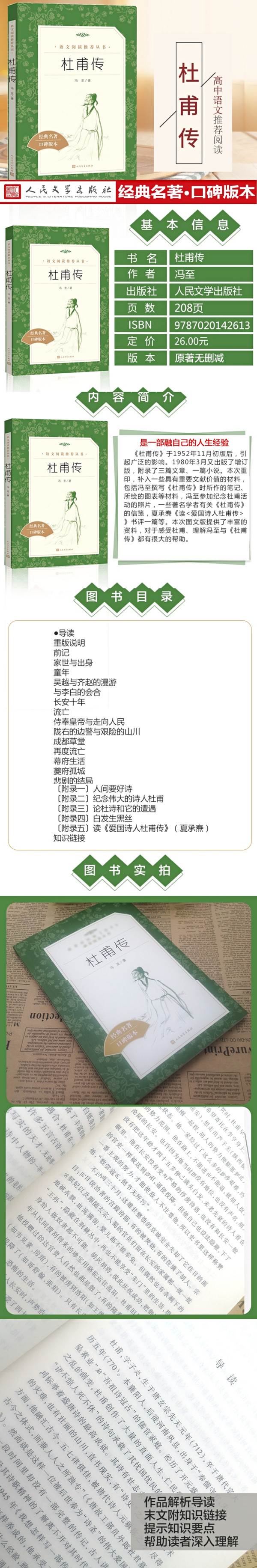 冯至是继闻一多之后的又一位致力于杜甫研究、致力于向文学界和全社会传扬杜甫精神的著名诗人。《杜甫传》于1952年11月初版后,引起广泛的影响。1980年3月又出版了增订版,附录了三篇文章、一篇小说。本次重印,补入夏承焘《读<爱国诗人杜甫传>》书评一篇等。