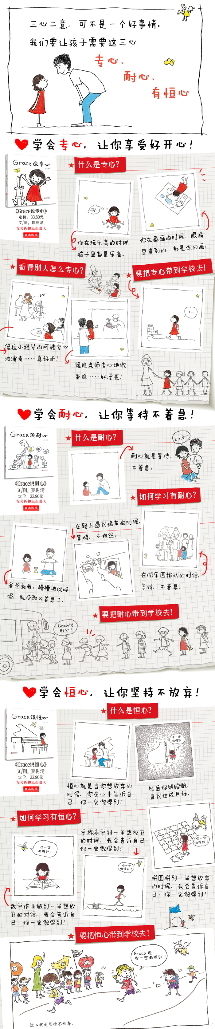 把这套有趣、有爱又有“心”的书摆在孩子面前,也许他们只花一刻钟阅读,就能逐渐养成受用一生的好习惯:专心、耐心和恒心。 学会专心,让你享受好开心! 学会耐心,让你等待不着急! 学会恒心,让你坚持不放弃!