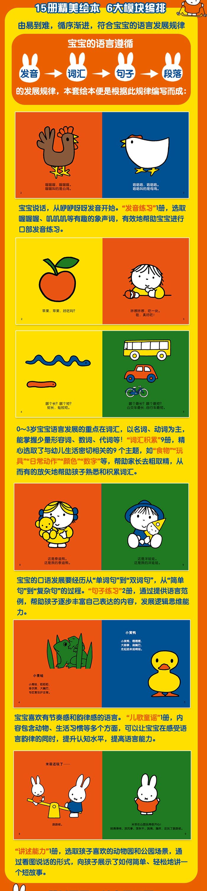 2. 15册精美绘本,内容丰富,充分满足宝宝语言学习的需求。