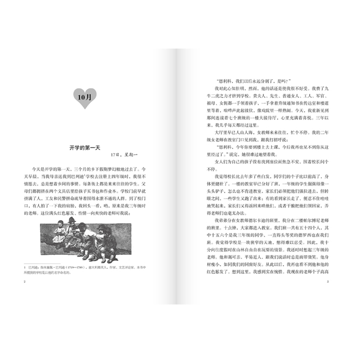 全书采用日记体的形式,记录了恩利科的成长经历,内容包括身边各种感人的小故事、父母为他所写的启发性的文章,以及老师在课堂上朗读的“每月例话”。书中描写了许多平凡而又善良的小人物:卖炭人、小石匠、铁匠的儿子、少年鼓手、带病上课的老师……以及他们平凡的日常生活。全书将“爱”浸入其中,大至国家、社会、民族的大我之爱,小至父母、师长、朋友间的小我之爱,处处扣人心弦,感人肺腑。