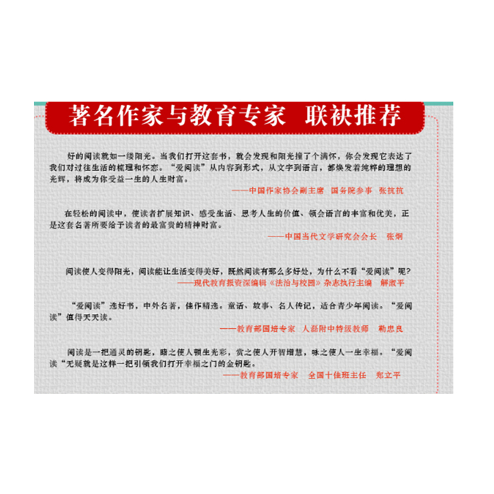 好的阅读就如一缕阳光。当我们打开这套书,就会发现和阳光撞了个满怀,你会发现它表达了我们对过往生活的梳理和怀恋。《爱阅读》从内容到形式,从文字到语言,都焕发着纯粹的理想的光辉,将成为你受益一生的人生财富。