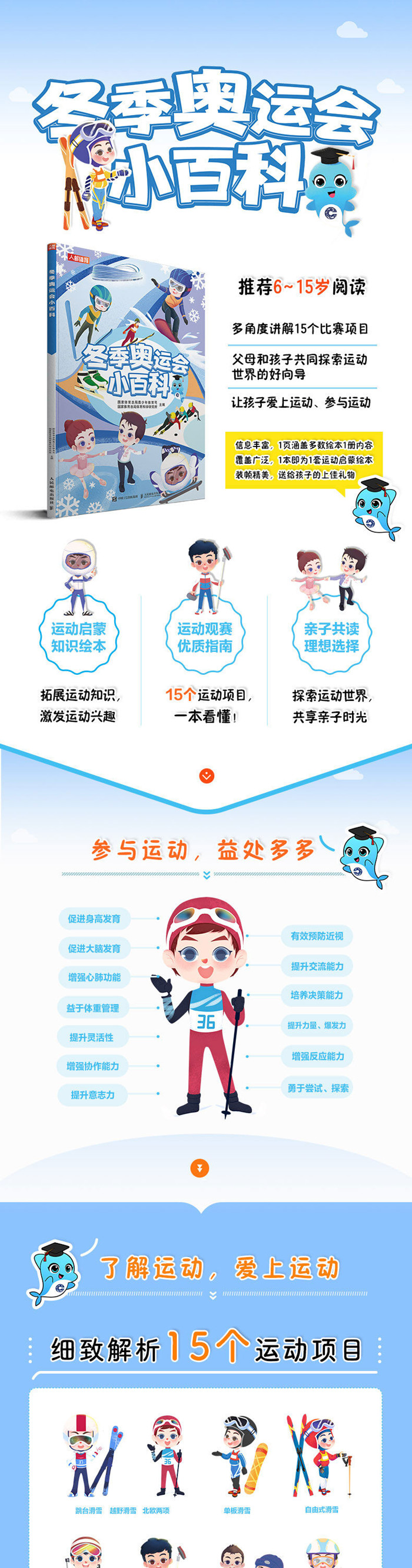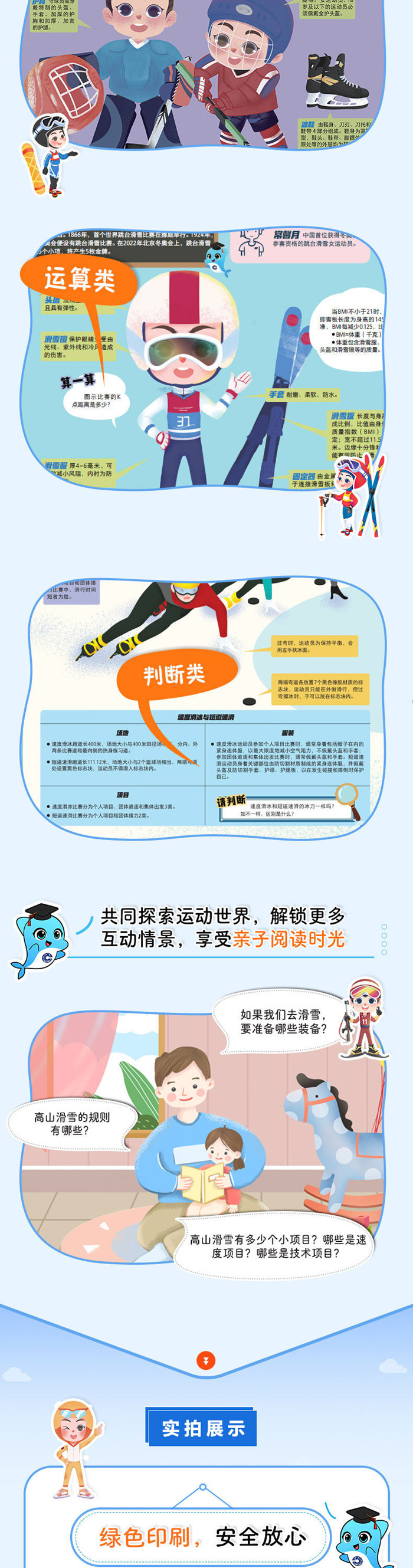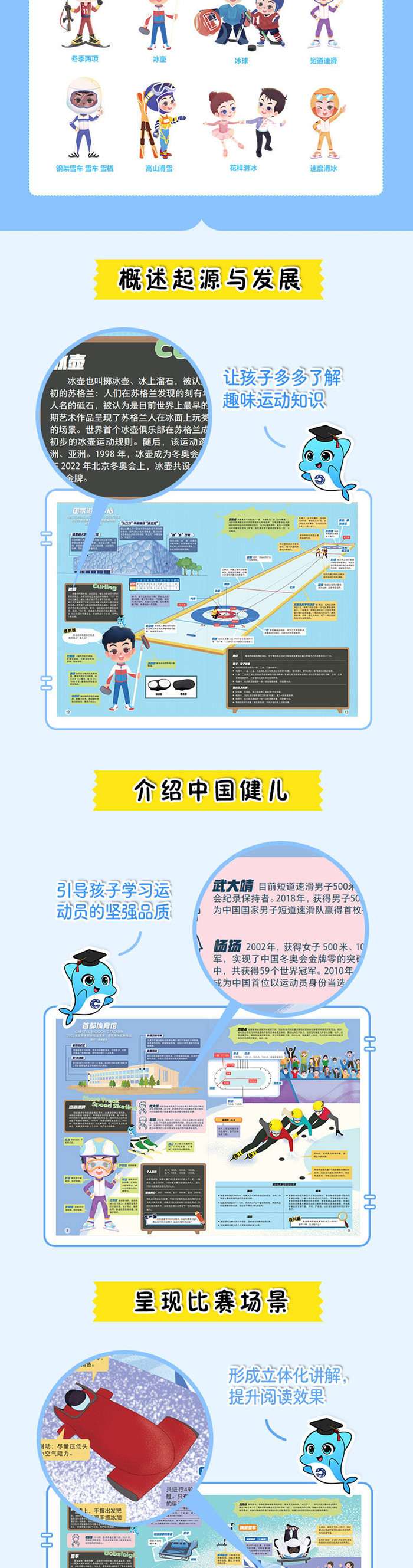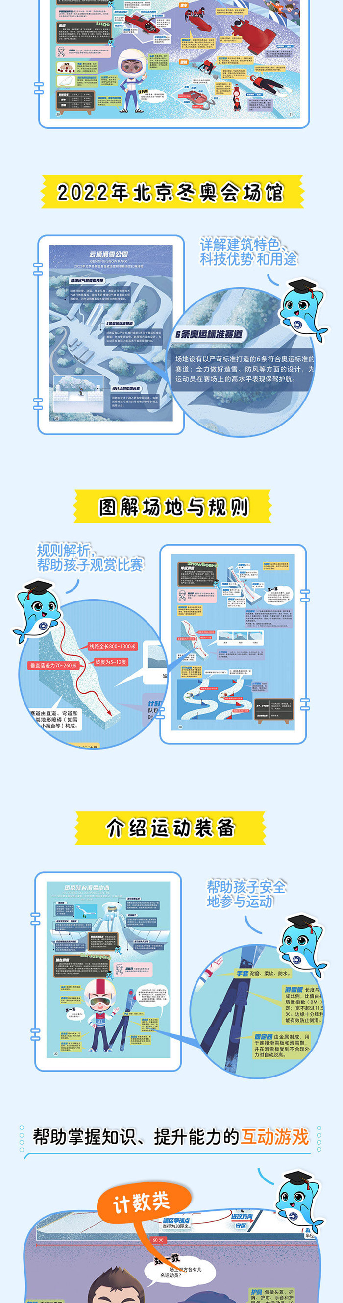 走入冰雪运动的世界,深入了解比赛项目知识,探索运动世界,变身冬奥科普达人。 ·冰雪运动启蒙知识绘本,拓展运动知识,激发运动兴趣。 ·冬奥观赛指南,多角度呈现并解析15个冬奥项目。 -概述各个项目的起源与发展,让孩子了解各项运动常识和趣味知识 -呈现比赛场景,立体化讲解,提升阅读效果 -图解场地与规则,提升孩子欣赏比赛的能力 -介绍运动装备,帮助孩子安全地参与运动 ·图文介绍2022年北京冬奥比赛场馆、场地的建筑特色、科技优势与用途。