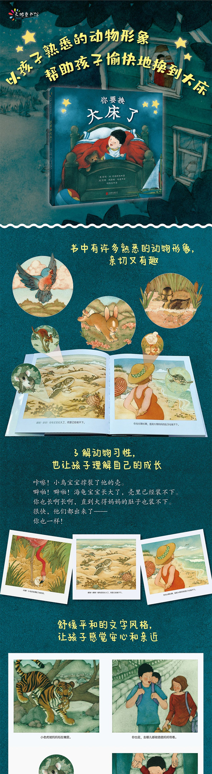 小马驹长大了,她现在睡在自己的马厩里。小睡在她的新屋里。小猫睡在他专用的篮子里。既然你也长大了,你会睡在哪里?以孩子熟悉的动物形象,帮助孩子理解自己在不断长大,让孩子愉快地从婴儿床换到大床上,顺利迈出成长的关键一步。