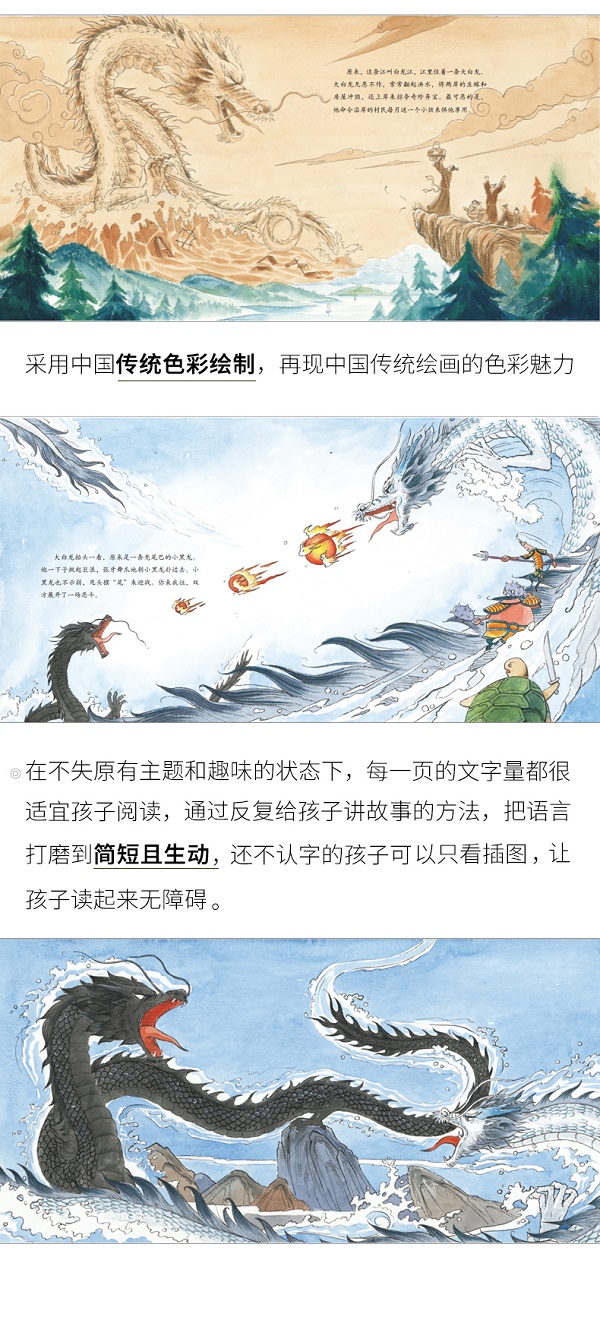 《小黑龙》是“中国传统故事”绘本系列中的一册,本书故事取材于“黑龙江”由来的民间传说,讲的是在山东的小山村里,李福的妻子生了一条小黑龙,小黑龙不被家人接受,飞到了白龙江里,最终在村民的帮助下打败了无恶不作的大白龙的故事。