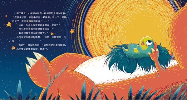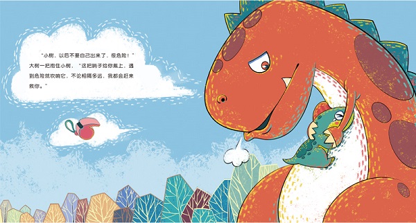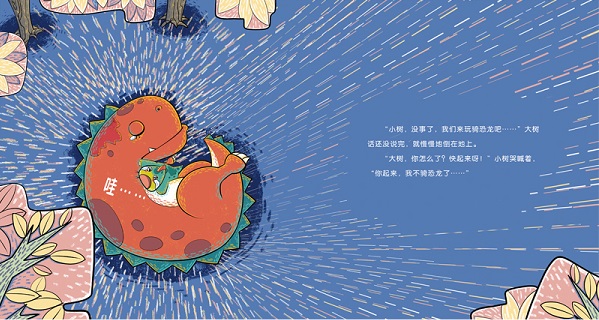 火山喷发,大地颤抖…… 远处,一只小鸭嘴龙战战兢兢地走了过来。 咦,这是哪儿? 轰隆隆 轰隆隆 咣当! 啊!谁敢打我的头, 我可是霸王龙! 小鸭嘴龙摸索着往前走,一不小心撞在了霸王龙的屁股上。 “哪里来的大树墩!”小鸭嘴龙生气地踢了一脚坐在地上的霸王龙。 “啊!谁敢踢我的屁股,我可是……”霸王龙转身站了起来,“我是……我是谁来着?” 霸王龙怎么也想不起来自己是谁了,它好像被大石头砸失忆了。 小鸭嘴龙同情地看着霸王龙:“你不知道自己是谁吗?好可怜呀!看你长得这么高、这么大,就叫你‘大树’吧!” “大树?好哇,我喜欢这个名字。小家伙,你这么小,那你就是‘小树’喽!” “大树,我们以后一起玩吧!” “好哇,好哇!” 每天天一亮,小树就喊:“我要骑恐龙,骑恐龙!” 大树总是闭着眼说:“再睡一会儿,再睡一会儿,好困呀!” “不嘛,不嘛,快起来。我要骑恐龙!” “好吧,好吧,骑恐龙喽!” 每天晚上,小树都会躺在大树怀里听大树讲故事:“在很久以前,夜空中只有一颗星星。有一天,星星不见了,夜空焦急地到处寻找……” “大树,为什么夜空要跟星星在一起呢?” “因为夜空想每天跟星星说晚安!” “我也想每天跟大树说晚安。” 小树半梦半醒地呢喃着:“大树,大树爸爸,晚安……” “爸爸?!你叫我爸爸!”大树感觉心里暖暖的。 小树紧紧地搂着大树,睡着了。