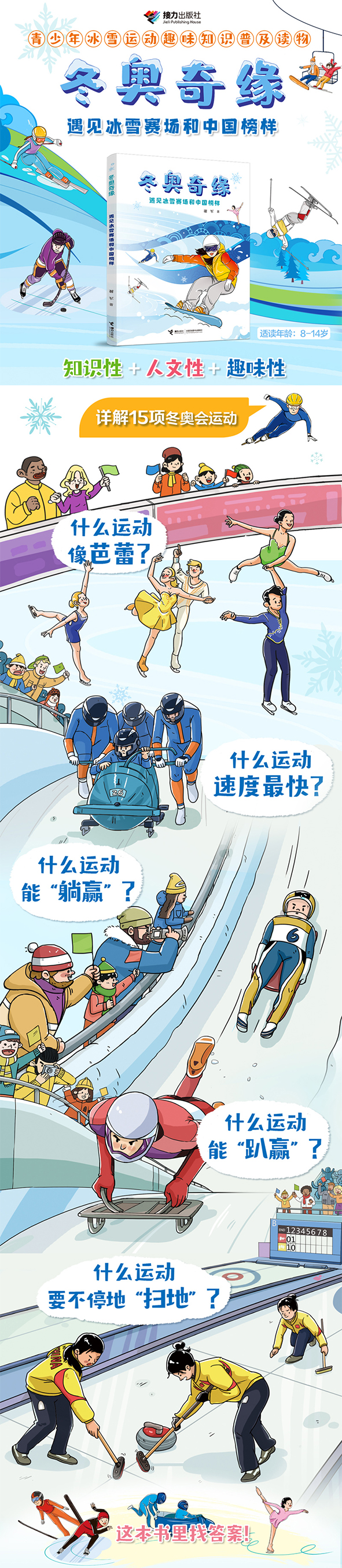 这是一本专门为青少年编写的冬奥运动知识读物。 本书介绍了花样滑冰、越野滑雪、北欧两项、钢架雪车等冬奥会全部15个运动项目。通过简洁的描述和直观的插图,小读者可以轻松了解每项运动的形式、特点和历史沿革等信息。除了基本知识的介绍,本书还特别设置了三个板块:“冰雪运动在中国”主要讲述中国各项冰雪运动发展中所实现的突破;“冬奥奇闻”汇集了冰雪赛场上的奇闻趣事;“冰雪之星”则讲述了50名运动员的杰出成就和动人事迹。这50名运动员中,有的通过刻苦训练屡获殊荣,有的带伤比赛而不轻言放弃,还有的怀着对运动的热情不断超越自我。其中,中国运动员们一往无前、勇争国际一流的事迹特别值得青少年学习。 中国举办冬奥会正是青少年了解冰雪运动的契机。希望这本书能让孩子们感受到冰雪运动的魅力,从而走近冰雪运动,爱上冰雪运动;也希望他们能够感受和学习运动员榜样积极参与、公平竞争、尊重对手与奋勇拼搏的精神,并因此受益终身。