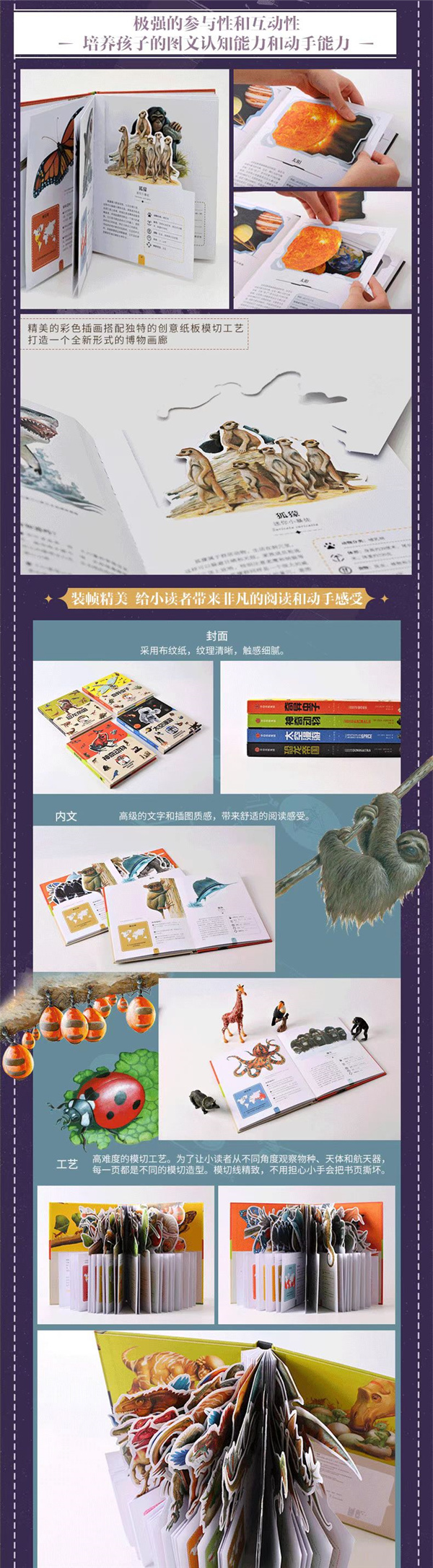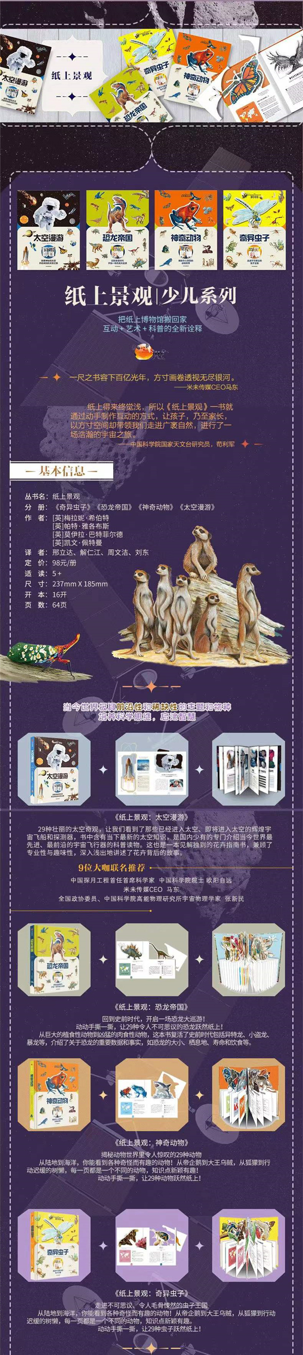★从空中杀手到寄生幼虫,有的可爱,有的让人汗毛竖立,你会了解到新的关于虫子的知识。 ★描述了每一种虫子如此吸引人的原因,包括虫子的重要数据和事实,如大小、栖息地、寿命和饮食,等。 ★本书语言简练有趣,生动活泼,引人入胜,对于小朋友来说轻松易懂。 ★独特的模切工艺按照模切线将空白部分撕下,就可以看到一个轮廓清晰的图形。撕完后把书立起来,就能看到一个立体的纸上博物馆。 ★知识前沿,绘图优雅,装帧精致,用色,工艺独特,学习知识的同时锻炼了小朋友的动手能力和协调能力,互动性强,是市面上的少儿科普读物。 ★本书装帧精美,封面采用布纹纸,内文采用300g双胶纸,用纸考究,模切形式独特,插图精美,使它成为了一本收藏价值的书。 ★自然学科领域的作者、获奖作者及国内译者,文字优美流畅、引人入胜 ★精致16开,便于儿童翻阅,更适合小朋友的小手撕模切线。
