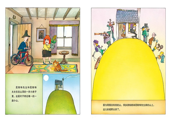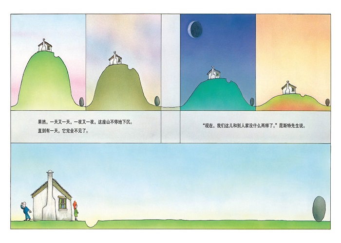 一个失而复得的故事 《从前有座山》,书名一眼看去让人联想到小时候入睡前,母亲低低细语的那个冗长故事。在这本书里,大卫·麦基以一种超乎寻常的故事构架,讲述了一个有关人性、富有哲学意味的寓言故事,开启了大人尘封已久的内心大门和孩童纯真心灵之窗。 故事的开头,一群游客喜欢到昆斯特家里来游玩,因为昆斯特夫妇的家在山顶,视野开阔,风景独好。夫妇俩觉得这里风景秀丽,但美中不足的是,因为有一块大石头矗立在厨房窗户后面,挡住了部分视线。人往往都有猎奇心理,当你见到一座高山,就想知道山那一边是什么。然而人也是贪婪的动物,昆斯特夫妇对络绎不绝到访游客的赞美之词沾沾自喜,并且开始迷失自我.......如果能够移走大石头,那么视野将更加开阔,风景必会美不胜收。 昆斯特先生几乎没有采用复杂的辅助工具,仅凭一把铁锹在石头一侧铲起几锹土,大石头就借助重力滚落山崖,如同一个负气而走的爱人。嗅着清新干净的空气,沐浴着山顶和煦的阳光,昆斯特夫妇长期以来的焦虑终于消失不见,“这个世界终于清净了”昆斯特夫人感叹道。然而事情果真如此吗?