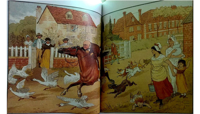 《约翰·吉尔品外史》是伦道夫·凯迪克的经典绘本之一。它本是18 世纪英国诗人威廉-考柏的作品。故事说的是,卖布商人吉尔品从朋友那儿借来一匹马,原本准备骑着它去庆祝自己的结婚纪念日,却不想这匹马儿一心只想回到主人那里,结果一路上制造出各种鸡飞狗跳、欢乐无比的闹剧,令人忍俊不禁、捧腹大笑。故事配上伦道夫·凯迪克精彩、鲜活的插画后,显得更加热闹非凡、诙谐幽默