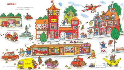 我想,斯凯瑞的书之所以那么吸引她,能让她自己从书柜里面找出来自己看,内容的丰富完整应该是最大的理由。这系列的书籍一反很多儿童书籍简单的常规,在一本书里面涉及了很多的东西,其中包括我们成人不了解不熟悉的知识,它真正把孩子当成了和我们一样认知的“人”。用孩子能看懂的图画的方式,告诉他们我们生活的这一个丰富多彩的世界,和世界上正在发生的各系列的事情。通过看书,小孩子了解到很多平时他还没有接触到的世界,以及接触了却没有深入了解的事情。这些图画吸引着他们一遍一遍的看书,一遍一遍的了解……