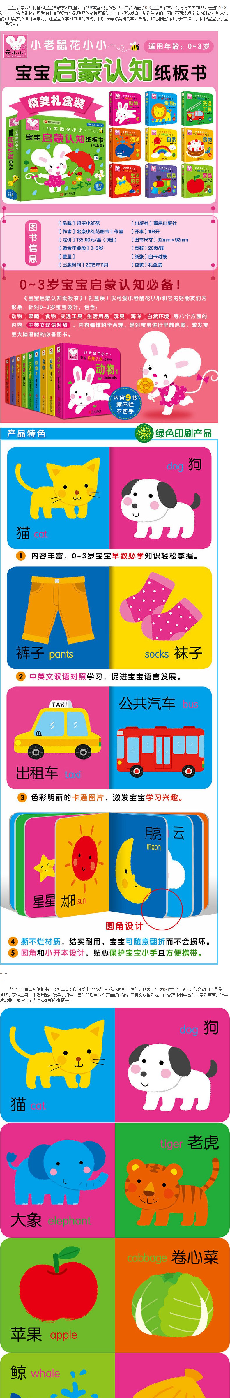 小老鼠花小小宝宝早教学习礼盒含9本撕不烂纸板书。内容涵盖了0-3宝宝早教学习的方方面面知识,是送给0-3岁宝宝的最佳礼物。可爱的卡通形象和色彩明丽的图片可促进宝宝的视觉发育;贴近生活的学习内容可激发宝宝的好奇心和求知欲;中英文双语对照学习,让宝宝在学习母语的同时,初步培养对英语的学习兴趣;贴心的圆角和小开本设计,保护宝宝小手且方便携带。