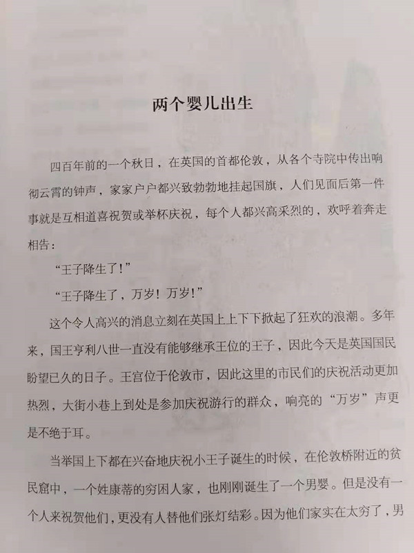 本书以16世纪的英国为背景,描写了贫儿和王子互换身份的童话式故事。一个阴差阳错的偶然机会,长相相同的王子爱德华和贫儿汤姆因互换衣服,从而导致了命运的颠倒。曾经的小乞丐成了王子的“替身”,真正的王子流落在外,受尽欺凌和嘲讽。后来,王子历经种种劫难,终于回到了王宫;而汤姆也将不属于自己的王位还给了王子。经过这样的“交换身份”,两个少年都懂得了很多东西……