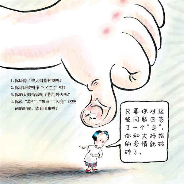 绘本指出儿童存在爱吮手指的习惯问题(儿童心理学中的口腔敏感期),用诙谐幽默的话语积极去引导改变。