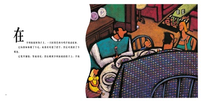 于是,亨利叔叔的第一位客人不请自来:这只橘黃色的小鸡居然走出了方格,向妹妹致敬,向哥哥招手,向“我”使眼色,然后跳到亨利叔叔的肚皮上享受它的晚餐。而当亨利叔叔恨不能伸出几双手来挠痒痒时,小鸡竟偷偷溜走,又偷偷在亨利叔叔的莓子冰淇淋盘中下了一个大大的蛋。它的得意,藏在昂起的头和偷偷的“坏笑”里,也藏在那双已经从容不迫擦干净的脚里—一活脱脱一个小小顽童!