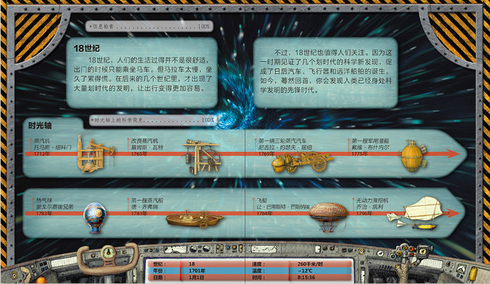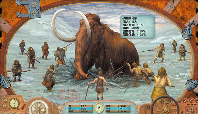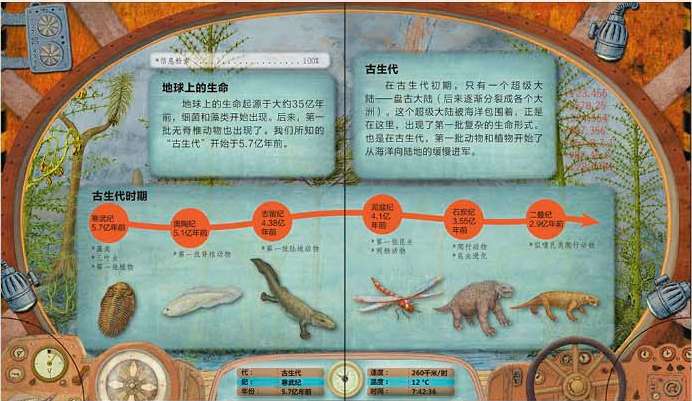欢迎踏上这艘科学时光机,当“时光的齿轮”转动到相应的位置,时光机将会带你“穿梭时空”,令人意想不到的画面即可出现在你的眼前!我们将跟随时光机分别来到古生代、中生代、新生代和第四纪4个不同的地质时代。在这里,你会见证地球上生命的起源。随着时光的变迁,你能陆续看到最有趣的史前蜥蜴、巨大的哺乳动物和原始人类与无数有趣的动物共同生活的场景。