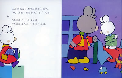 小白尿在裤子上、尿在床上的时候,妈妈只是说:“哦!发生‘意外事故’了。”爸爸更是轻松和有见识:“别难过,亲爱的,每个人都经历过样的事情的。我,妈妈,爷爷,奶奶,我们都有过。”第二天在学校里,康坦睡午觉的时候也尿床了。小白安慰他说:“别担心,纳塔莉老师以前也尿过床的。”纳塔莉说:“是的,老师小的时候也尿床。康坦先换衣服,然后我们一起做游戏。”
