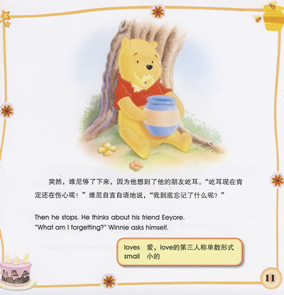 迪士尼英语“小熊维尼温馨双语故事”系列采用中英双语不对称对照的方式,中文部分生动有趣,英文部分简单易懂,同时解决了孩子外语学习的意愿和能力问题。每个故事还有一个英语学习主题,并围绕这个主题设计了好玩的英语小游戏,为孩子量身打造最适宜的双语学习环境,增强孩子对英语学习的兴趣和热情。同时,该系列还帮助孩子理解并掌握一些重要的基本知识概念,如数字和颜色,并以其特有的迪士尼卡通人物和故事情节激发孩子的想象力和创造力。