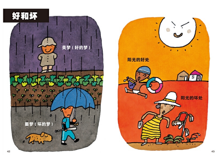 著名绘本作家五味太郎以他独具创意的构思、妙趣横生的画面表现方式向孩子呈现语言的魅力。在书中有6对相对应的形容词,作者通过多个情节设置,通过在不同条件下的比较,来表现语言的丰富性和现实中的相对性,与其说这是关于语言的认知书,不如说是以语言的线索串联起来的一个个有趣的故事。图书内文采用翻页形式,不但是为内容讲述服务,同时凸显为孩子带来阅读的乐趣。本书中介绍的词语包括:大和小,干净和脏,容易和困难,亮和暗,软和硬,好和坏。在书的最后,五味太郎总结了他的创作构想,有利于读者对本书的更进一步了解。