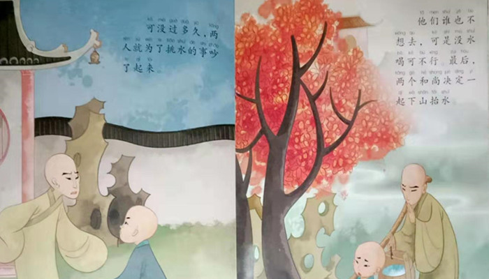 《三个和尚》——山上的一座庙里住着一个小和尚,他自己打水吃。后来来了一个和尚,两人就挑水吃。又来了一个和尚,三个和尚就没水吃了。后来老鼠在夜里出来捣乱导致寺庙失火了,三个和尚才尚奋力救火的同时也醒悟了,他们想出了用水的好办法。