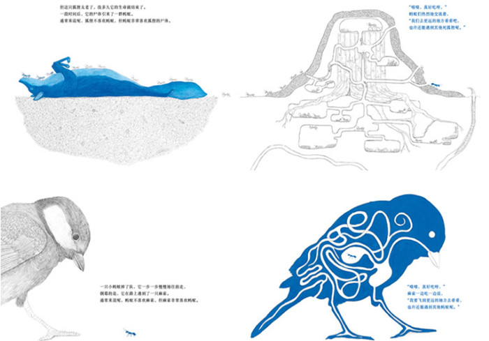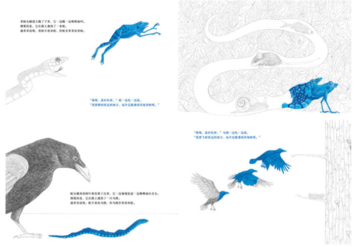本书讲述了一个有趣的食物链故事。作者以蓝色小苍蝇为始讲述故事,当蓝色小苍蝇被青蛙吃掉后,青蛙变成了蓝色的,当蓝色青蛙被蛇吃掉后,蛇又变成了蓝色的……蓝色小苍蝇就是一根线,串起故事,将难懂的食物链呈现得简单明了。