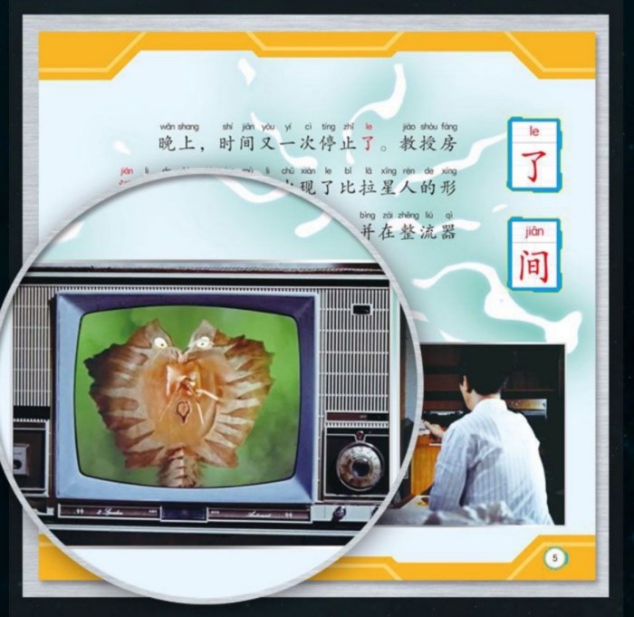 晚上,时间又一次停止了。教授房 间里的电视屏幕里出现了比拉星人的形 象。它控制了尤西玛教授,并在整流器 上做了手脚。