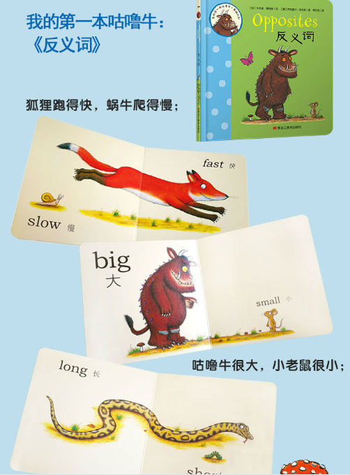 《我的第一本咕噜牛·基础认知》是很受宝宝受欢迎的系列,以朱莉娅·唐纳森和阿克塞尔·舍夫勒联手创作的畅销绘本《咕噜牛》为基础,包括认颜色、学数数、反义词、动物动起来4个主题。打开厚厚的纸板书,走进又明亮又大胆的书中世界,一起来玩儿吧!