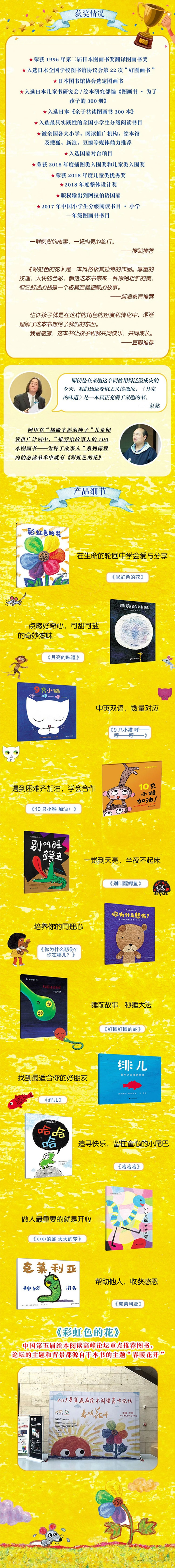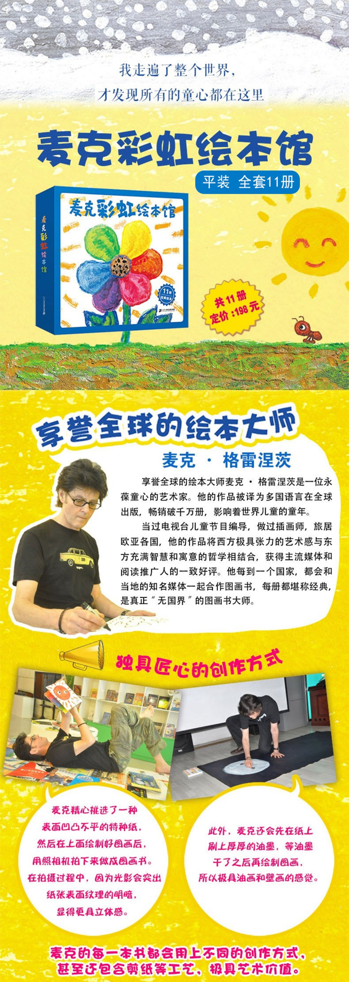 《麦克彩虹绘本馆》内含绘本大师麦克·格雷涅茨著作的11部图画书,分别是曾获日本绘本奖的代表作《月亮的味道》,在华创作的《好困好困的蛇》《哈哈哈哈》《小小的蛇大大的梦》,改版升级的《彩虹色的花》《绯儿》《9只小猫呼——呼——呼——》《10只小猴,加油!》,以及新作《别叫醒鳄鱼》《泰迪熊》《克莱利亚》。麦克`格雷涅茨擅长用不同的画材营造出别具风貌的图画。通过质朴的线条、奔放的色彩营造出具有强烈的表现力的、浸渍着童趣的图画语言,作品深受读者喜爱。