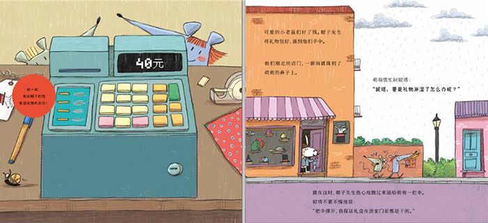 3. 财商启蒙的同时,传递正确的金钱观。两只小老鼠为了给妈妈买生日礼物,努力地想办法,费了不少周折,从而让孩子明白一个道理:金钱来之不易,要靠劳动来换取,同时应珍惜劳动成果。