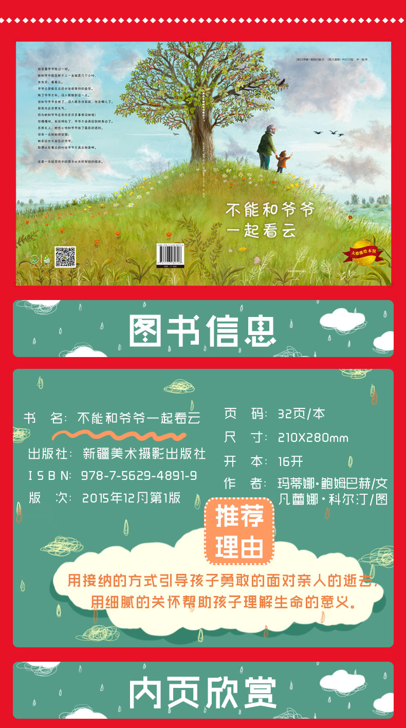 莉莉最喜欢爷爷,爷爷总是带着她看云,给她讲故事。可是有一天爷爷去世了,没有人告诉莉莉爷爷去了哪里。莉莉先是很生气,直到参加了爷爷的葬礼才渐渐明白爷爷再也回不来了。但是莉莉永远不会忘记爷爷。玛蒂娜·鲍姆巴赫编文、凡蕾娜·科尔汀绘画的这本《不能和爷爷一起看云》通过莉莉前后的情绪变化,告诉孩子如何正确面对亲人离世,帮助孩子尽快走出面对这一痛楚留下的心理阴影。