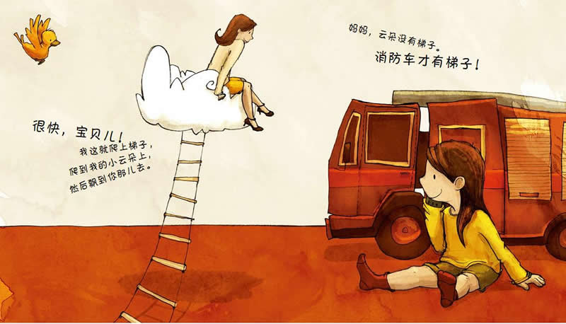 小女孩给妈妈打电话问妈妈什么时候下班回家。通过一系列无厘头的对话,让孩子认识了消防车、轮船、潜水艇等交通工具的特征。对话充满温情,是一本与孩子互动、游戏的优秀亲子绘本。