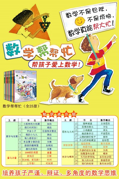 “数学帮帮忙”系列全套共25册,分为“数字与运算”、“量与计量”、“图形与几何”、“探索规律”和“统计与概率”共五部分内容,几乎涵盖了小学阶段所有重要的数学知识。