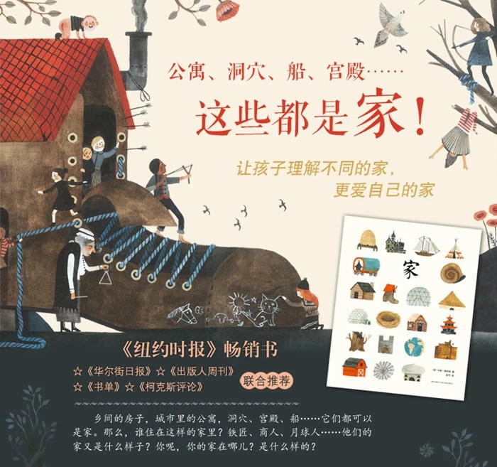 儿童图画书读物。乡间的房子,城市里的公寓,洞穴、宫殿、船,甚至是鞋子……它们都可以是家。那么,是谁住在这样的家里?铁匠、商人、艺术家、月球人……他们的家又是什么样子?你呢,你的家在哪儿?又是什么样的?只是简简单单的一个家字,作者赋予了它无限的生命力。在美妙的蓝灰、褐和砖红色的调色板下,作者卡森别具一格地描绘了形态各异的”家”,从最熟悉的乡间小屋到亚特兰蒂斯的水下世界再到遥远的外太空,让孩子理解不同的家,更爱自己的家。