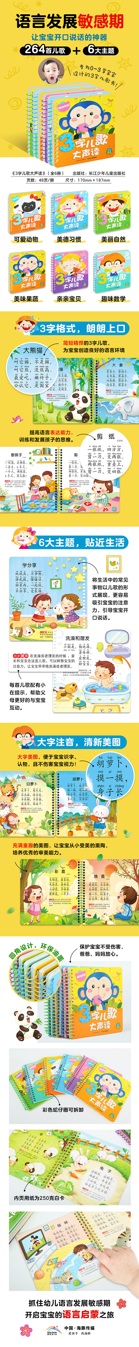 0-3岁是幼儿语言发展的关键期,家长如果在这个黄金时期,为幼儿提供良好的语言学习环境,可以让幼儿的语言发展得到事半功倍的效果,为幼儿以后的语言表达能力打下良好的基础。0-3岁的宝宝无法说出较长的句子,家长需要从幼儿实际语言能力出发,为他们选择句式简短精悍,语言浅显、明快,节奏感强的读物,这样既便于宝宝记忆,又能增强宝宝的自信心。儿歌语句简短、用词精练、韵律优美,读起来朗朗上口,便于孩子吟诵。多听、多读儿歌,能帮助宝宝矫正发音、初步认识事物、正确掌握概念,并能培养宝宝的语言表达能力,训练和发展孩子的思维。 《3字儿歌大声读》将生活中的常见事物以“3字儿歌”的形式展现给0-3岁宝宝,内容包括美丽自然、可爱动物、趣味数学、美味果蔬、亲亲宝贝、美德习惯六大主题。书中内容贴近生活,充满童趣;三字格式,朗朗上口;大字大图,能够保护视力;贴心亲子互动版块,共享亲子时光。 264首儿歌,句式简短、节奏感强,含有丰富的知识和教育意义,让宝宝在读儿歌中,认物、识字,提高语言表达能力,提升思维能力。
