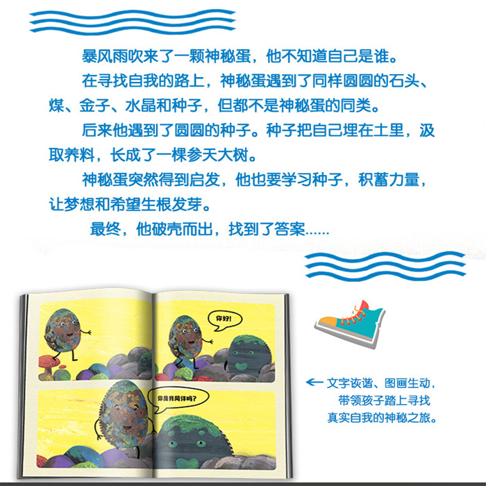 一个圆圆的神秘蛋来到, 他不知道自己是谁。于是他开始参照身体相似的物体来认识自己。月亮、太阳、石头、煤球、金粒、水晶, 看上去都和自己很像, 但他们各有特点。直到遇到一粒种子, 认识到梦想的力量, 神秘蛋才恍然大悟: 每一个个体都是的, 做自己, 成为自己, 不需要去模仿任何人, 只要有梦想, 一切都有可能。