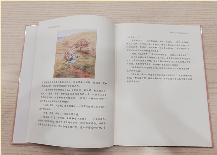 小猪鲁滨逊是一个很可爱的小家伙:粉嘟嘟的,一双蓝颜色的小眼睛,小脸胖乎乎的,双下巴。鲁滨逊如果闭上一只眼睛,再用另一只眼睛斜着朝两边看的话,就能看到鼻尖上的那枚指环。他总是一副心满意足、乐呵呵的样子。一天到晚在农场里跑来跑去,一边唱着小调,一边嘴里不停地打着呼噜:“呜咦、呜咦、呜咦!”在鲁滨逊离开后,他的姨妈们格外怀念这些小曲。