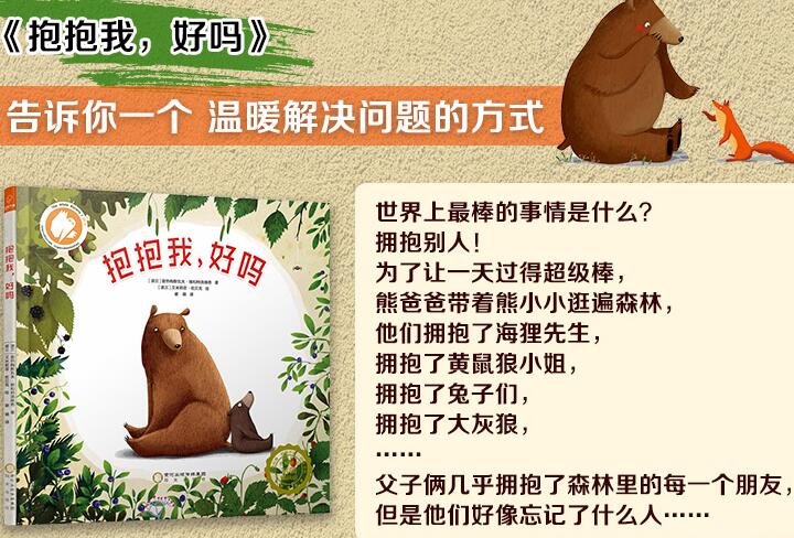 1. 暖萌治愈系系列绘本,*册。主题,爱的传递。爱是相互的,当你把自己的爱心传递给别人的时候,别人也会感受到那份温暖和快乐,被爱感染的他会把获得的这份爱继续传递下去。在《抱抱我,好吗》这本绘本中,看似简单的一个拥抱,其实是爱的传递的过程,熊小小在熊爸爸的带领下,把他们的爱传递给森林里的每一个朋友,在令朋友们感受到幸福和快乐的同时,熊小小和熊爸爸也收获了满满的快乐和幸福,令他们的一天过得超级棒!
