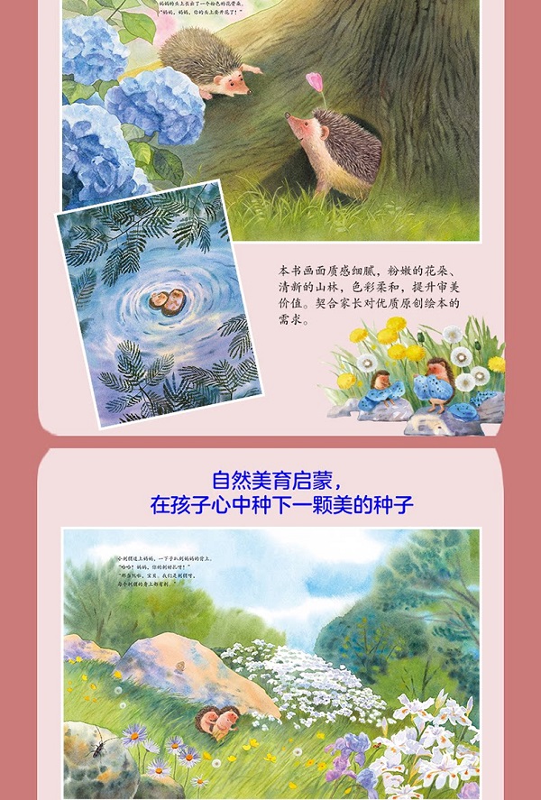 刺猬妈妈太喜欢花了,她觉得每一朵花都那么漂亮,它们软软的,香香的,是这个世界上好看妙的东西。刺猬妈妈给自己做了花帽子、花披巾和花裙子,给小刺猬做了花帽子和花马夹,他们是最快乐的刺猬妈妈和小刺猬。一天清晨,小刺猬惊奇地发现,妈妈头上居然长出了一朵花,小刺猬用手碰了碰,花也不掉下来,真是太神奇了!刺猬妈妈多喜欢自己身上的这朵花呀!日复一日,刺猬妈妈头上的花越长越多,渐渐地,她觉得自己的身子越来越重……有一天,刺猬妈妈再也走不动了,她身体的大部分都变成了花,和泥土紧紧地搂抱在一起。作者以妈妈最爱的花为线索串联故事,在淡淡忧伤的底色上,顽强地开出一片绚烂的花海。